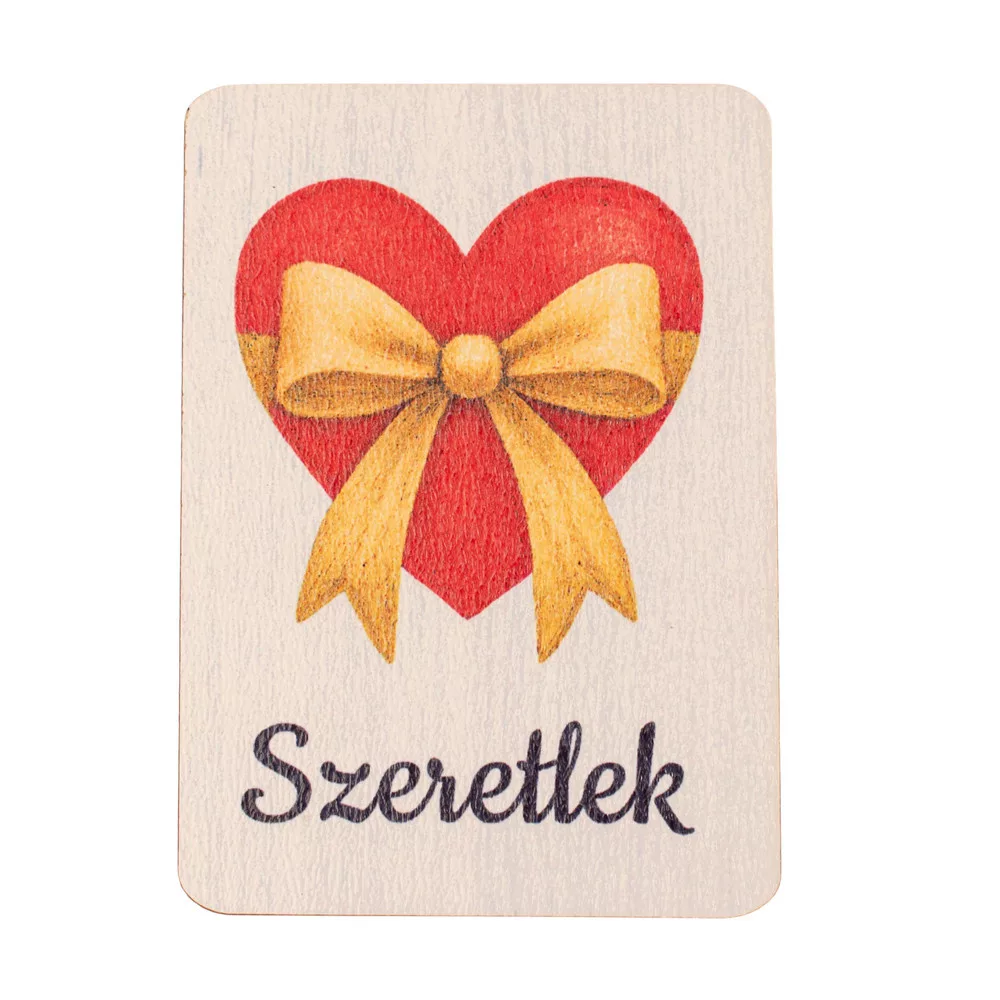 4db. "Szeretlek" feliratos, sárga masnis szívecske dekor fa tábla, 7 × 5 cm