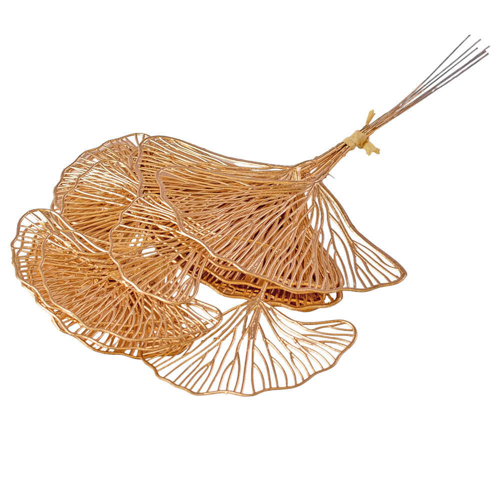 A dekoratív ginkgo biloba köteg hat darab, metál arany színű szálból áll, melyek elegáns, légies megjelenést biztosítanak. A 37 cm magas levelek különleges formája és csillogó felülete ünnepi, glamour vagy modern enteriőrök látványos kiegészítőjévé teszi. Ideális koszorúkhoz, vázadíszekhez vagy exkluzív hangulatú dekorációs kompozíciókhoz.5999093345059