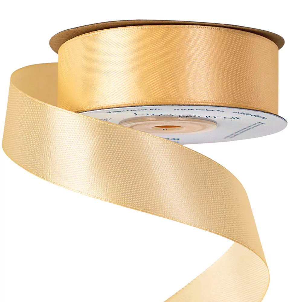 Kellemes krém színű szatén szalag. Gyönyörű dekorációs elemként használhatjuk esküvői dekorációként: mint székszoknya masni, asztaldísz, teremdísz, autódísz, szalvétagyűrű. A meghívók díszítéséhez is kitűnő választás a szatén szalag. A virágüzletek elengedhetetlen kelléke, mely a virág vagy virágdoboz díszítéséhez, ajándékcsomagoláshoz is nagyon jó választás. 2,5cm széles és 22m 86cm hosszúságú selyemfényű szatén díszítő szalag, védőfóliával és papírkoronggal. A szatén szalagok az árai miatt is nagyon közkedveltek. Gazdaságos kiszerelésűek és az egyszerűségük miatt nagyon olcsón megvásárolhatjuk. 5999093308542