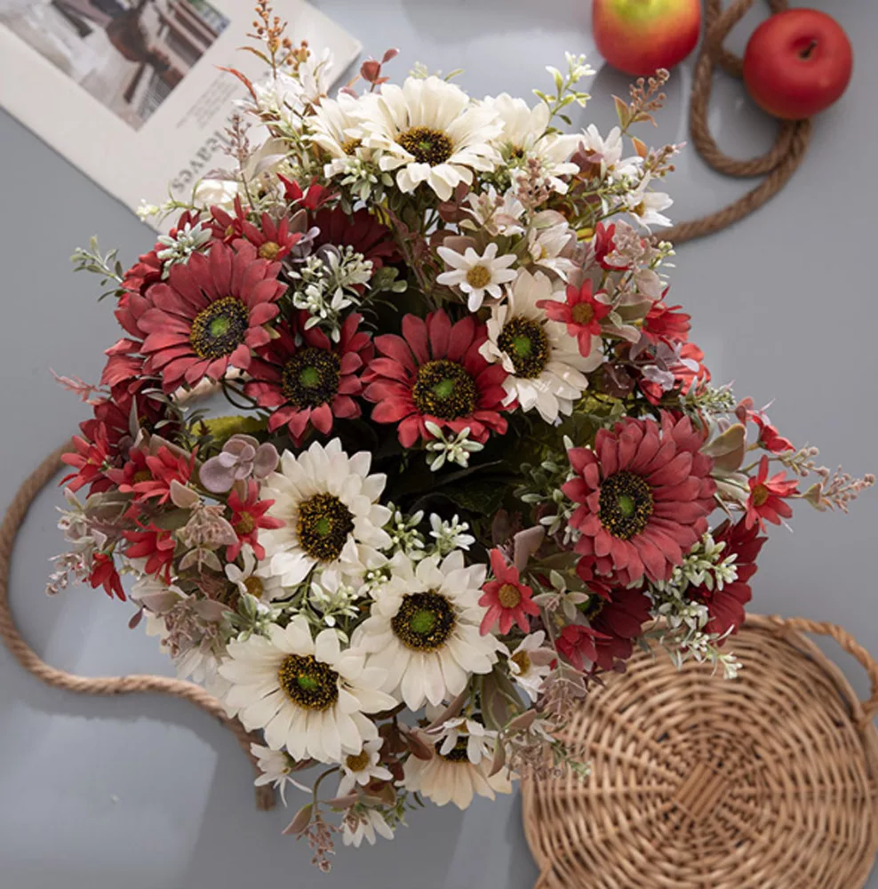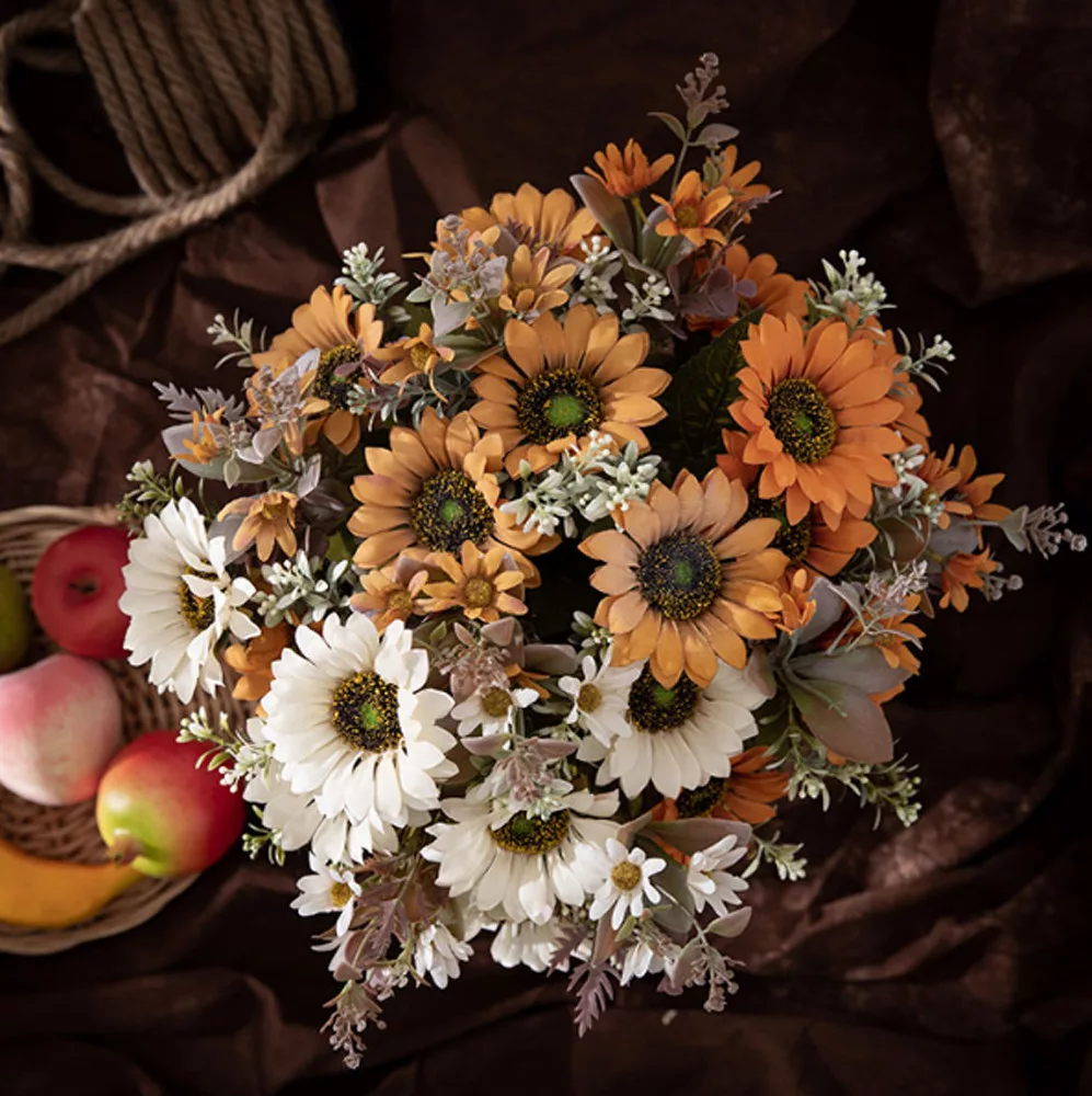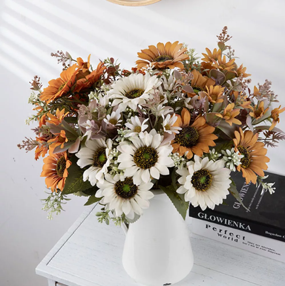 A napraforgó selyemvirág csokor egy élethű és tartós dekoráció, amely 42 cm-es magasságával és 9 cm-es virágfej átmérőjével bármely helyiségbe vidámságot és természetes szépséget hoz. Ideális választás otthoni dekorációhoz vagy ajándékként, amely soha nem hervad el.
