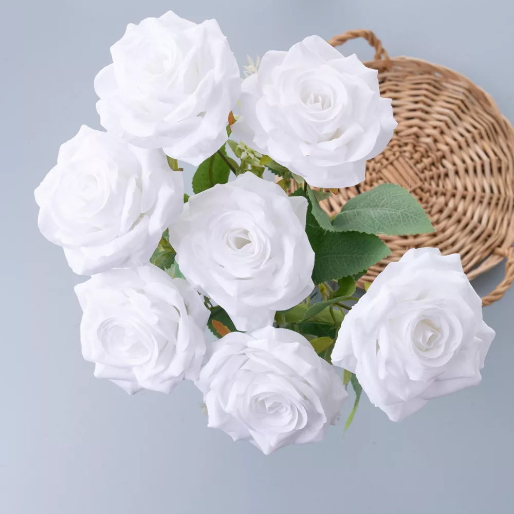Rózsa selyemvirág csokor, 7 ágú, 41cm magas - Fehér